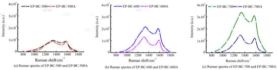 The total Raman spectra intensity represented the total amount of oxygen-containing functional groups. The Raman spectra of extra biochar at the temperatures of 500 °C, 600 °C, and 700 °C are shown in Figure 5. In Figure 5, it can be seen that the total spectral area of extra biochar prepared at 500 °C, 600 °C, and 700 °C has slightly decreased, indicating a decrease in the content of oxygen-containing functional groups on the surface of biochar.