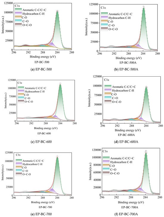 The presence of carbon elements on the surface of biochar catalysts was further investigated and analyzed. Fine spectral analysis was conducted on the C1s orbitals of biochar catalysts, and the fine spectrum of biochar revealed the changes in its surface functional groups before and after the reaction. The C1s in the XPS analysis of extra biochar are shown in Figure 6. There was a significant difference in the C1s spectrum of extra biochar as a catalyst in XPS analysis before and after pyrolysis. Figure 6 shows an asymmetric C1s peak, indicating the presence of complex carbon forms in biochar. The C1s peak were deconvoluted into peaks of different categories corresponding to sp2 C (284.46 ± 0.3 eV), sp3 C (285.15 ± 0.3 eV), and oxygen-containing groups such as C-O (286.23 ± 0.2 eV), C=O (287.49 ± 0.3 eV), and O=C-O (288.66 ± 0.4 eV) in extra biochar catalyst. The sp2 C reflected the aromatic structure in biochar catalysts, while sp3 C generally belongs to aliphatic chain structures. After using 500 °C, 600 °C, and 700 °C extra biochar catalysts during corn stover pyrolysis, the surface carbon element content increased, up to 3.48%, 1.46%, and 7.43%, respectively. This indicates that the volatile components generated by corn stover pyrolysis undergo transformation on the surface of the extra biochar and are assembled on the extra biochar matrix, consistent with the results of Raman analysis.
