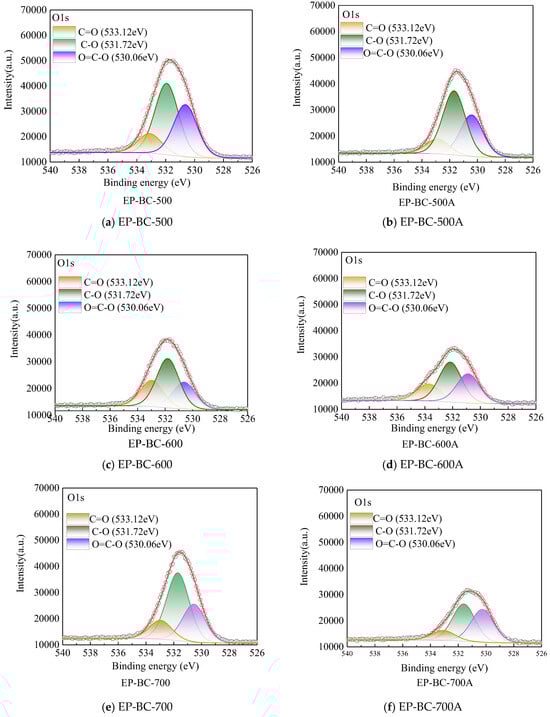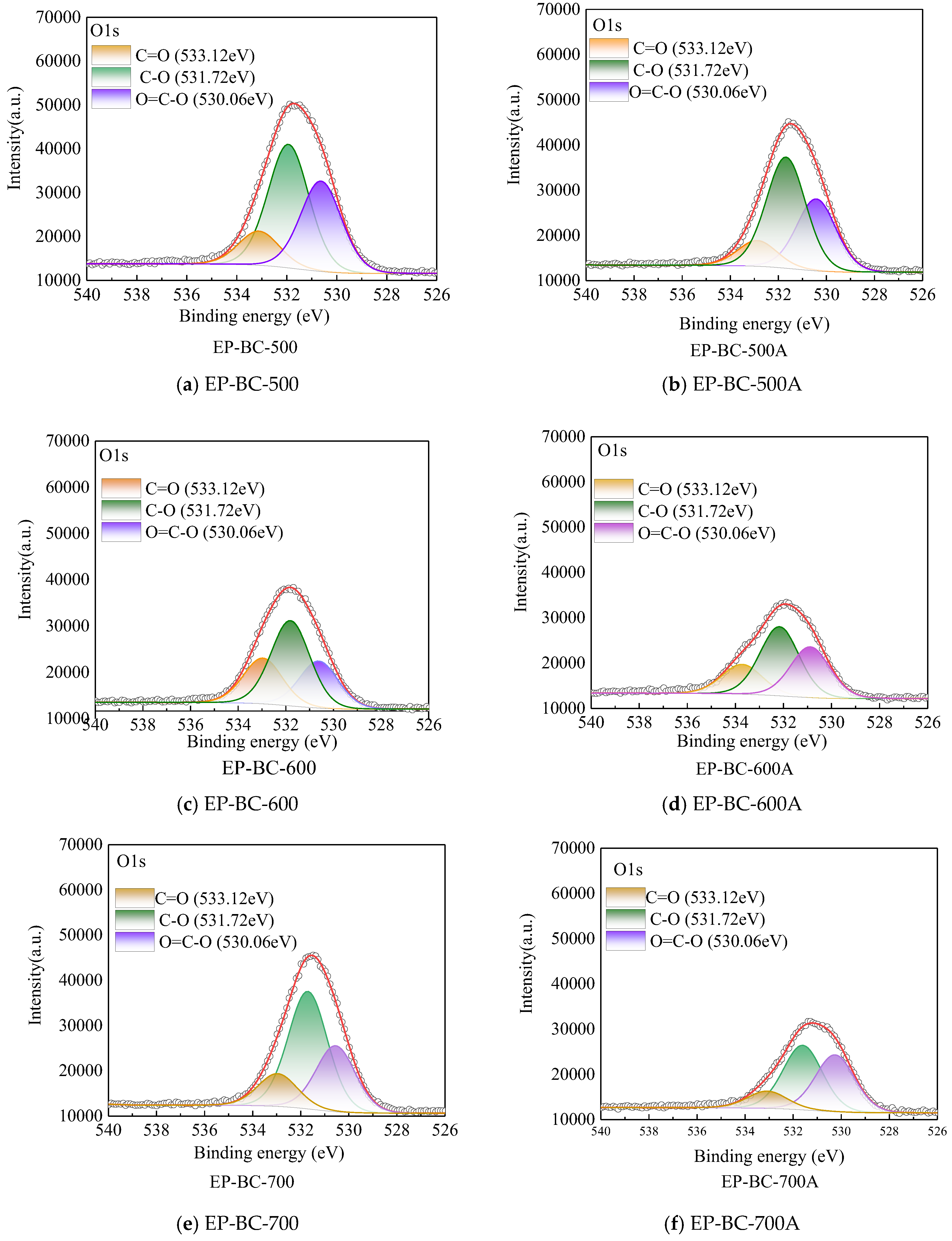 The O1s spectra of the three kinds of biochars are shown in Figure 7. It can be observed that oxygen atoms exist in the form of C (O), such as carbonyl C=O, phenols\alcohols\ethers C-O, and carboxyl O=C-O structures. Nevertheless, when reacted as a catalyst during corn stover pyrolysis, although the peak shape of O changed, the C (O) peaks distribution showed no evident change. Compared with that of EP-BC-500, EP-BC-600, and EP-BC-700, the proportions of oxygen atoms in EP-BC-500A, EP-BC-600A, and EP-BC-700A showed a descending trend, up to 3.74%, 1.49%, and 7.31%, respectively. The peaks of carbonyl C=O, phenols\alcohols\ethers C-O, and carboxyl O=C-O on the three kinds of extra biochar catalyst shrank to different degrees, generally. And for the extra biochar catalyst at temperatures of 500 °C, 600 °C, and 700 °C, carboxyl O=C-O, carbonyl C=O, and ether bonds C-O, respectively, tended to be active sites on the surface, which is conducive to the cracking of volatile components during corn stover pyrolysis.