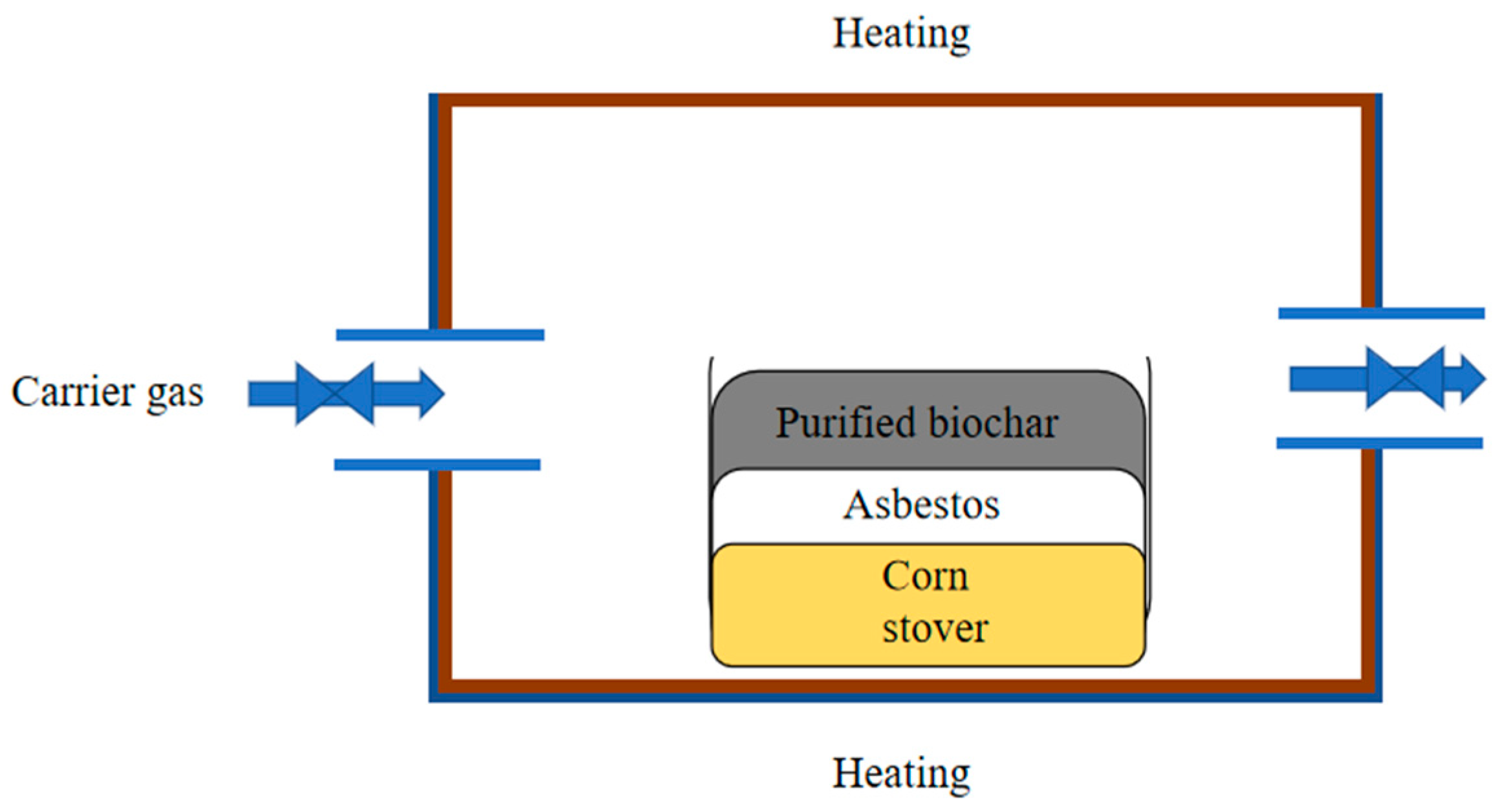 The pyrolysis experiment of corn stover was carried out in a quartz tube-equipped fixed-bed reactor (SG-GL1700, Shanghai Institute of Optics and Precision Mechanics, Chinese Academy of Sciences, Shanghai, China) under carrier gas-free conditions. The catalytic zone was located above the pyrolysis zone, at the same location as the reactor, separating zones with quartz wool. The schematic diagram of the pyrolysis test is shown in Figure 1. The inner diameter of the quartz reaction tube is 80 mm and the length is 1000 mm, 20 ± 0.1 g of corn stover samples were placed in a quartz boat in blank groups, and 3 ± 0.1 g extra biochar was stacked in the catalytic zone on the top of 20 ± 0.1 g corn stover raw material in a quartz boat in experimental group. Then, quartz boats were pushed to the central pyrolysis zone of the reaction tube. The reactor was heated at a certain heating rate (20 °C/min) from 25 °C to the preset temperatures (500 °C, 600 °C, and 700 °C). After the reactor reached the preset temperature, it was held at this temperature for 60 min. Once the components were evaporated from the corn stover sample, they formed pyrolysis vapor, and the fresh pyrolysis vapors were passed directly through extra biochar in the catalytic zone. Then, the part of the pyrolysis vapor adhered onto the wall of the quartz tube, forming residual tar, and the portion of pyrolysis vapor outside the reactor was collected as non-condensable gases, a light aqueous phase, and a heavy, viscous tar phase. Tin foil was laid inside the quartz tube to collect residual tar. The resulting biochar and residual tar were a mixture of three parallel experiments. The blank groups were named U500-20, U600-20, and U700-20; the resulting biochars were named CU500-20, CU600-20, and CU700-20. The residual tars were named RTU500-20, RTU600-20, and RTU700-20 in the blank groups. The experimental groups were named ST500-20, ST600-20, and ST700-20, and the resulting biochars were named STRTU500-20, STRTU600-20, STRTU700-20, and the residual tars were named STCU500-20, STCU600-20, and STCU700-20 in the experimental groups. After the pyrolysis reactions, the extra biochars as catalysts on the quartz wool were collected and named EP-BC-500A, EP-BC-600A, and EP-BC-700A.