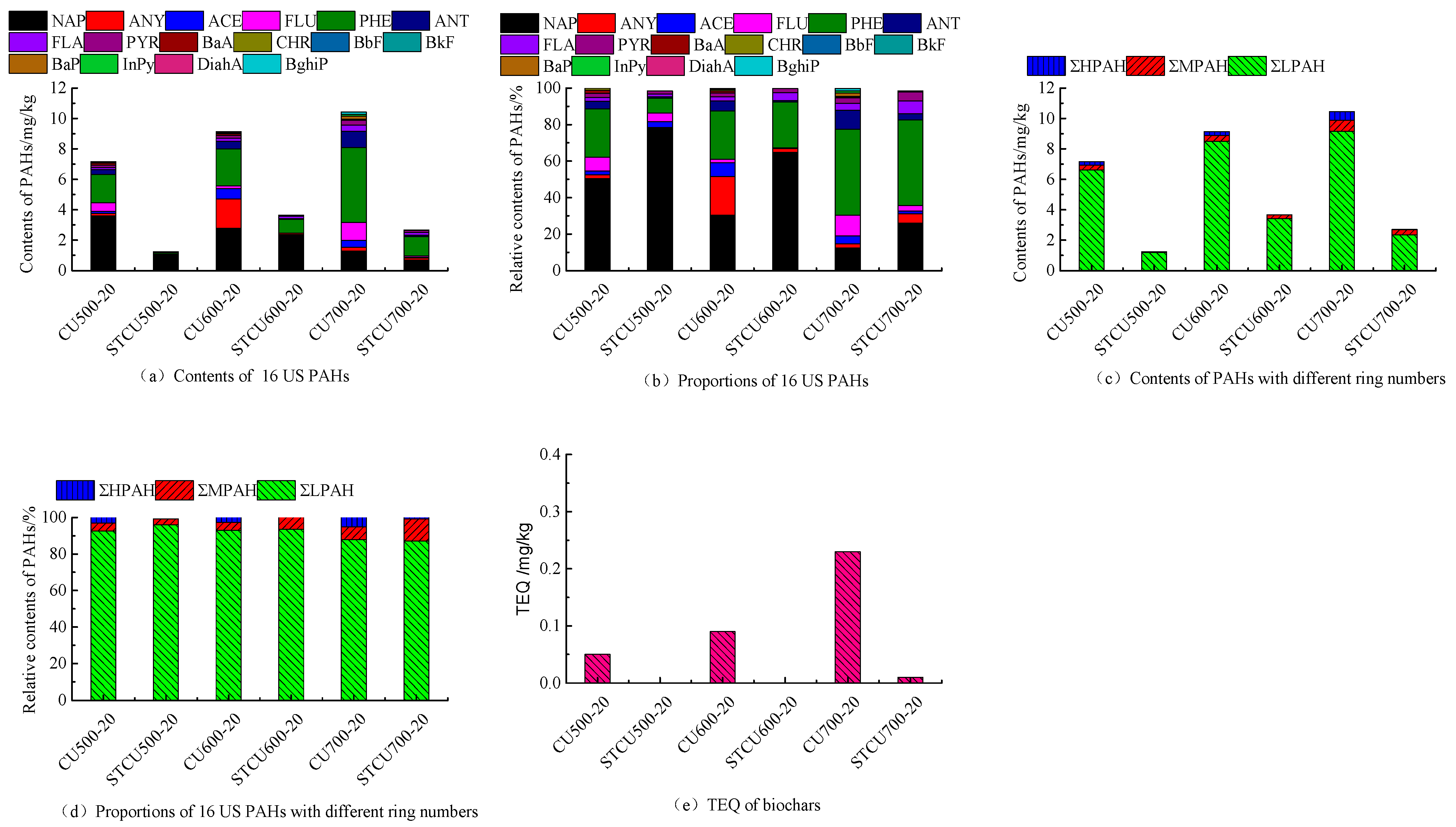 Figure 2a presents a temperature increase from 500 to 700 °C, resulting in a rise in PAHs concentration from 7.15 mg/kg to 10.44 mg/kg in corn stover biochar generated when pyrolysis was performed. The highest concentration in CU600-20 and CU500-20 is NAP, while in CU700-20 it is PHE (Figure 2b). The trend of NAP descended from 3.60 mg/kg to 1.29 mg/kg with pyrolysis temperatures. On the contrary, the trend of PHE increased from 1.88 mg/kg to 4.92 mg/kg. It can be inferred that NAP undergoes thermal cracking, due to its conversion as intermediates from medium to HPAHs [,]. ANY and ACE undergo a trend of first increasing and then decreasing, indicating that the consumption pathway of 3-ring PAHs transfers a greater number of rings []. The PHE monomer is generated by stripping alkyl groups from alkylated forms of PHE []. The abundance of LPAH (NAP, ANY, ACE, FLU, PHE, ANT) in total PAHs can reach 87.88~93.02%, following the order: CU600-20 > CU500-20 > CU700-20 (Figure 2d). The concentrations of MPAH (FLA, PYR, BaA, CHR) in CU500-20, CU600-20, and CU700-20 range from 0.51 mg/kg to 0.76 mg/kg (Figure 2c). Low concentration of HPAH (0.07 mg/kg~0.51 mg/kg) has only been observed in CU600-20 (BaP, BghiP) and CU700-20 (BbF, BkF, BaP, DiahA, BghiP InPy) (Figure 2c). The proportions of different ring-number PAHs depended on the pyrolysis temperatures [].