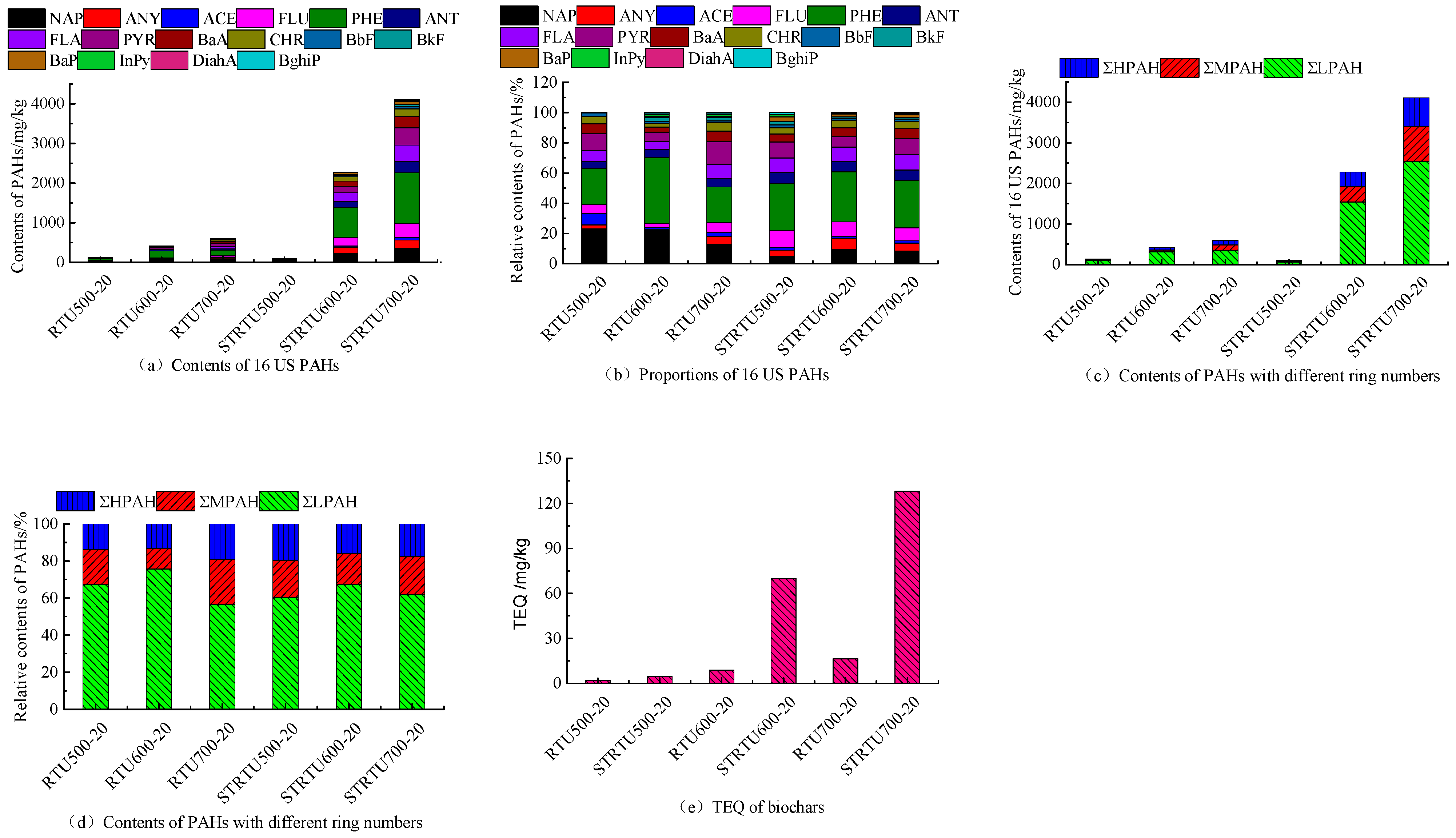The Toxic Equivalency Factor (TEF) of PAHs in biochar is mainly used to evaluate the toxicity of biochar. The toxicity of each PAH monomer is related to its molecular weight, and high molecular weight PAHs typically exhibit higher toxicity. In order to accurately evaluate the toxicity of PAHs in biochar, TEQ was calculated based on the toxicity equivalence factor (TEF) and the concentration of each PAH monomer according to Equation (1).
