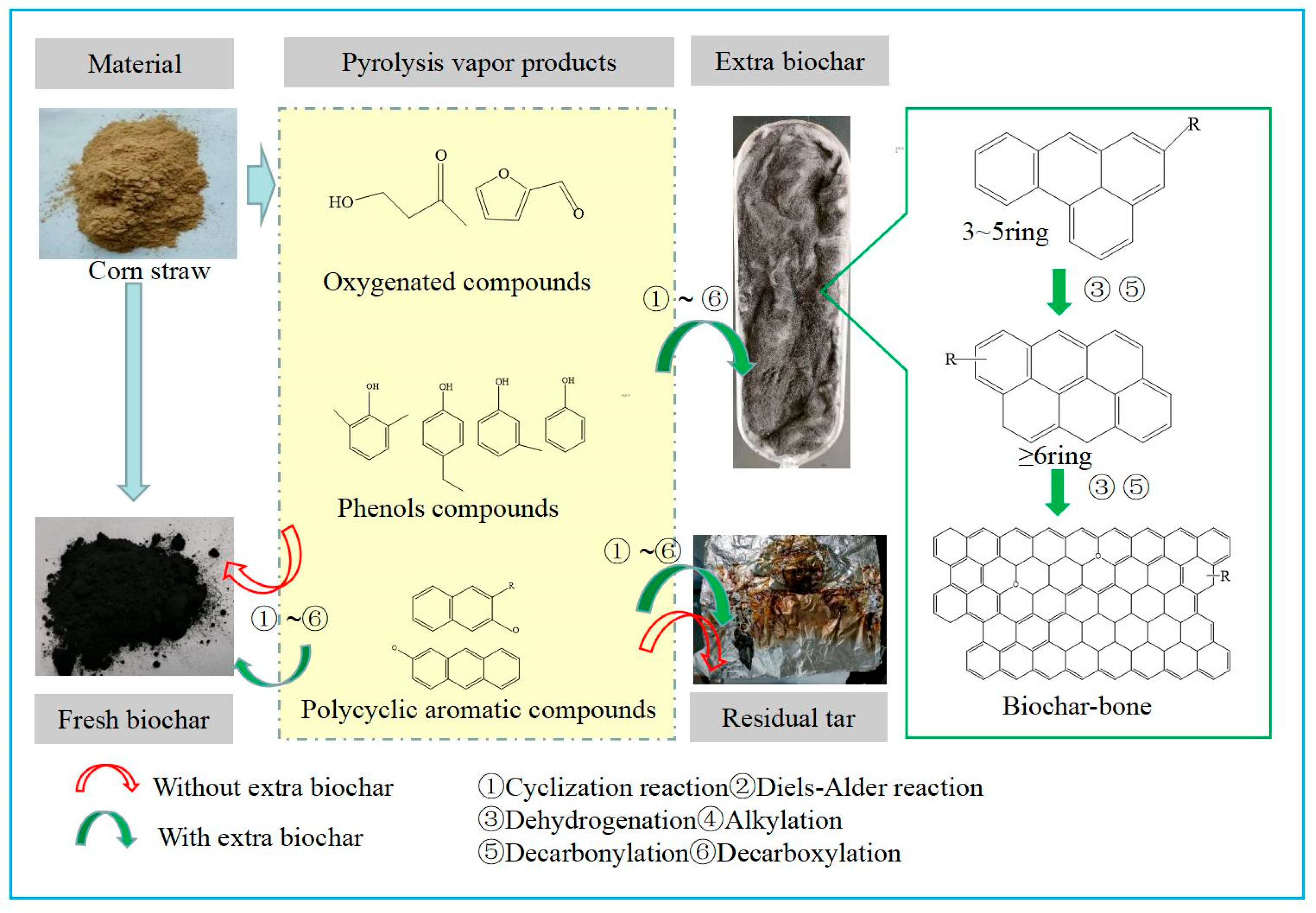 Briefly, from the change concentrations of PAHs in newly generated biochar in the experimental group with extra biochar, it can be seen that the formation of PAHs in biochar is mainly due to the secondary reaction of vapors (up to 59.94~82.45%), and there are relatively few PAHs formed through the solid-phase mechanism []. Therefore, weakening secondary reactions of vapors is the main direction of minimizing PAHs formation in biochar. To this end, to place acceptors for the migration of carbon elements in vapors would be a promising measure.
