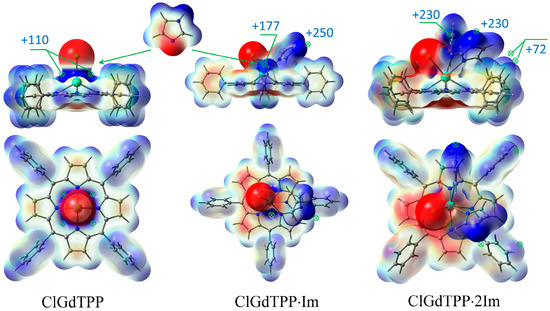 The coordination of ClGdTPP complex with Im ligands is highly expected in imidazole medium and it was also considered based on ESP analysis. Taking into account the apical Cl atom, the coordination of one or two imidazole molecules is possible in this case. Chlorine provides a vicinity of negative charge density but leaves quite an open positive space around Gd atom, with four points of the ESP maximum (+109.9 kJ/mol) for imidazole attachment to its negative nitrogen centers (Figure 2 and Figure 3). One imidazole molecule provides the attractive maximum +250.1 kJ/mol of its H–N bond and shields a part of the positive area, but there is still one accessible positive ESP point of +177.2 kJ/mol for another ligand attachment. Finally, a second imidazole molecule closes the site. The hindrance from the couple of imidazole ligands and the absence of a noticeable ESP maximum near Gd atom in ClGdTPP·2Im prevent further coordination. Thus, the highest coordination number of ClGdTPP is 7 in the case of two imidazole ligands, which complete the coordination surroundings. The maxima of +230.3 kJ/mol near imidazole ligands and 59.3 ÷ 72.1 kJ/mol close to hydrogen atoms of terminal benzine rings provide interaction only at these points, which is an additional protection by Gd atom against dioxygen attack.