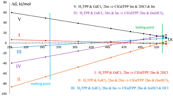 On the whole, the energy dependencies on temperature demonstrate only two dominant reactions (I and II) with the lowest ΔG in boiling imidazole. Despite two other schemes of ClGdTPP·2Im formation reaching negative ΔG at room temperature, the processes cannot proceed as effectively because there are almost zero free imidazole molecules in the cold medium or chemical reaction with GdCl3 crystal.