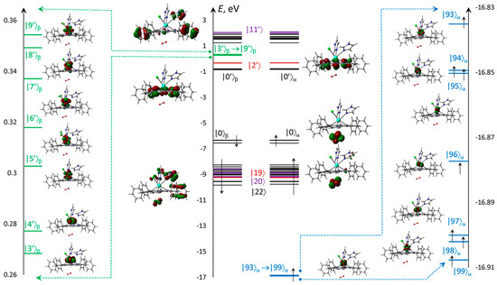 Scheme and numbering of f-MOs relatively to the frontier π-type |0⟩ = HOMO and |0′⟩ = LUMO calculated with ωB97XD&xQc for ClGdTPP·2Im·O2. MOs formed from f-AOs for vacant (green strips) and occupied (blue), as well as localized on ClGdTPP (black), on dioxygen (red), and the others with significant imidazole participation.