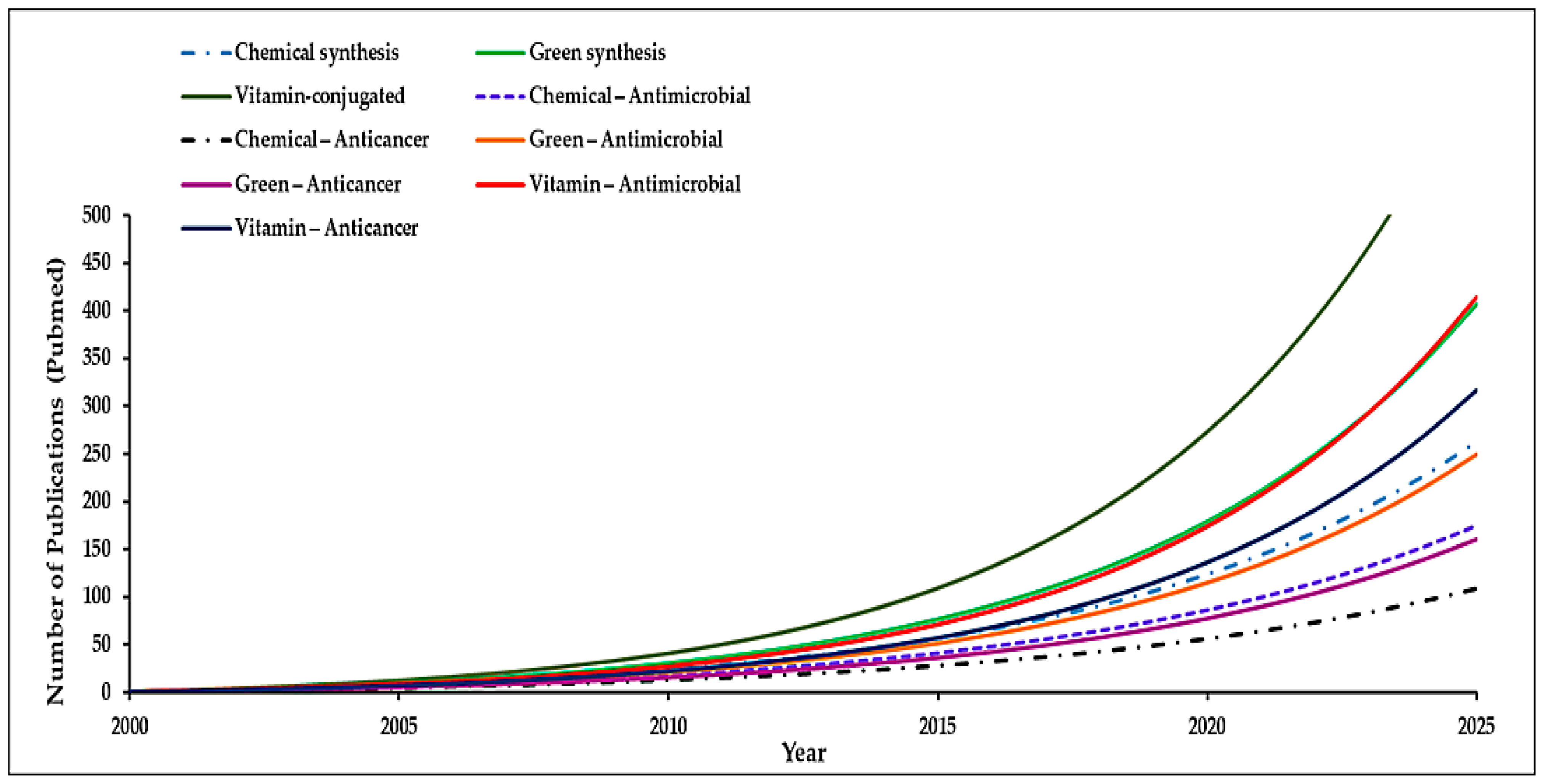 | 18 | Ag NPs + Biotin, D-Pantothenic acid & Nicotinic acid | Chemical reduction with NaBH4 | ~10 nm spherical | UV-Vis, TEM, FTIR, DLS, TGA, FE-STEM | Antimicrobial | Effective at low concentrations (15.62–62.5 μg/mL) against planktonic cells & biofilms. | [83] |