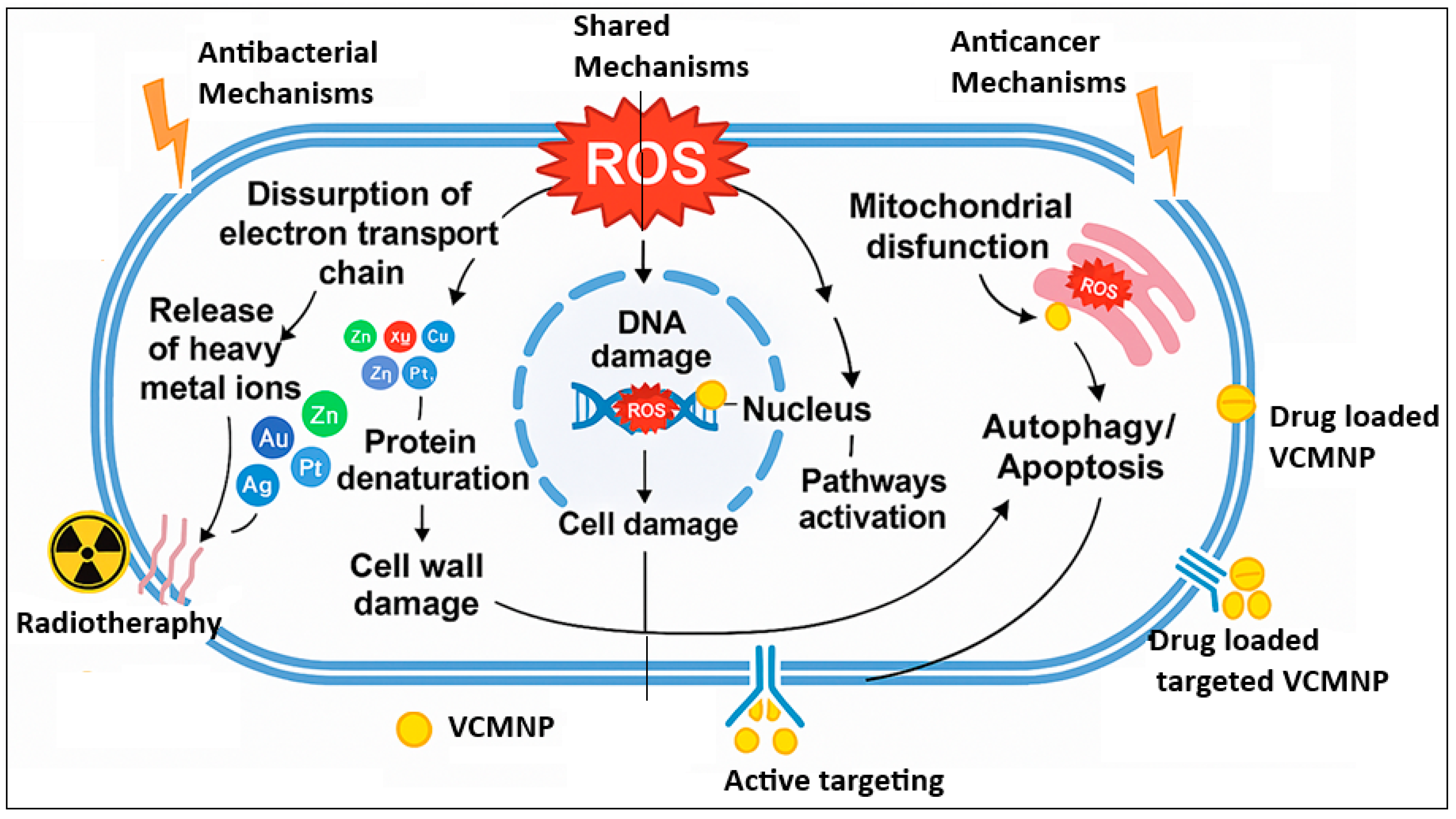 | 2 | Au + Vitamin C (with algal EPS) | Green biosynthesis | ~6–40 nm spherical AuNPs | UV–Vis, XRD, TEM, FTIR | Antibacterial: Multi-strain (E. coli, S. aureus, S. enterica, S. mutans, Candida spp.). Anticancer: Tested against MCF-7, A549, and CaCo-2 cells. | Most effective: >88% kill of E. coli and ~83% of S. aureus under light (via ROS generation), and ~70% growth inhibition of MCF-7 breast cancer cells. | [68] |