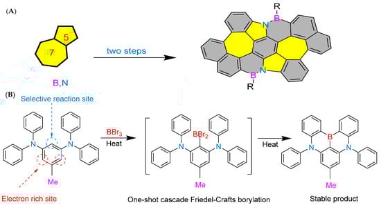 - Chen, X.B.; Tan, D.H.; Yang, D.T. Multiple-boron-nitrogen (multi-BN) doped π-conjugated systems for optoelectronics. J. Mater. Chem. C 2022, 10, 13499–13532. [Google Scholar] [CrossRef]