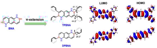 - Wang, X.Y.; Narita, A.; Feng, X.L.; Müllen, K. B2N2-Dibenzo[a,e]pentalenes: Effect of the BN Orientation Pattern on Antiaromaticity and Optoelectronic Properties. J. Am. Chem. Soc. 2015, 137, 7668–7671. [Google Scholar] [CrossRef]