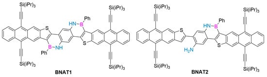 - Zhuang, F.D.; Sun, Z.H.; Yao, Z.F.; Chen, Q.R.; Huang, Z.; Yang, J.H.; Wang, J.Y.; Pei, J. BN-Embedded Tetrabenzopentacene: A Pentacene Derivative with Improved Stability. Angew. Chem.-Int. Ed. 2019, 58, 10708–10712. [Google Scholar] [CrossRef]