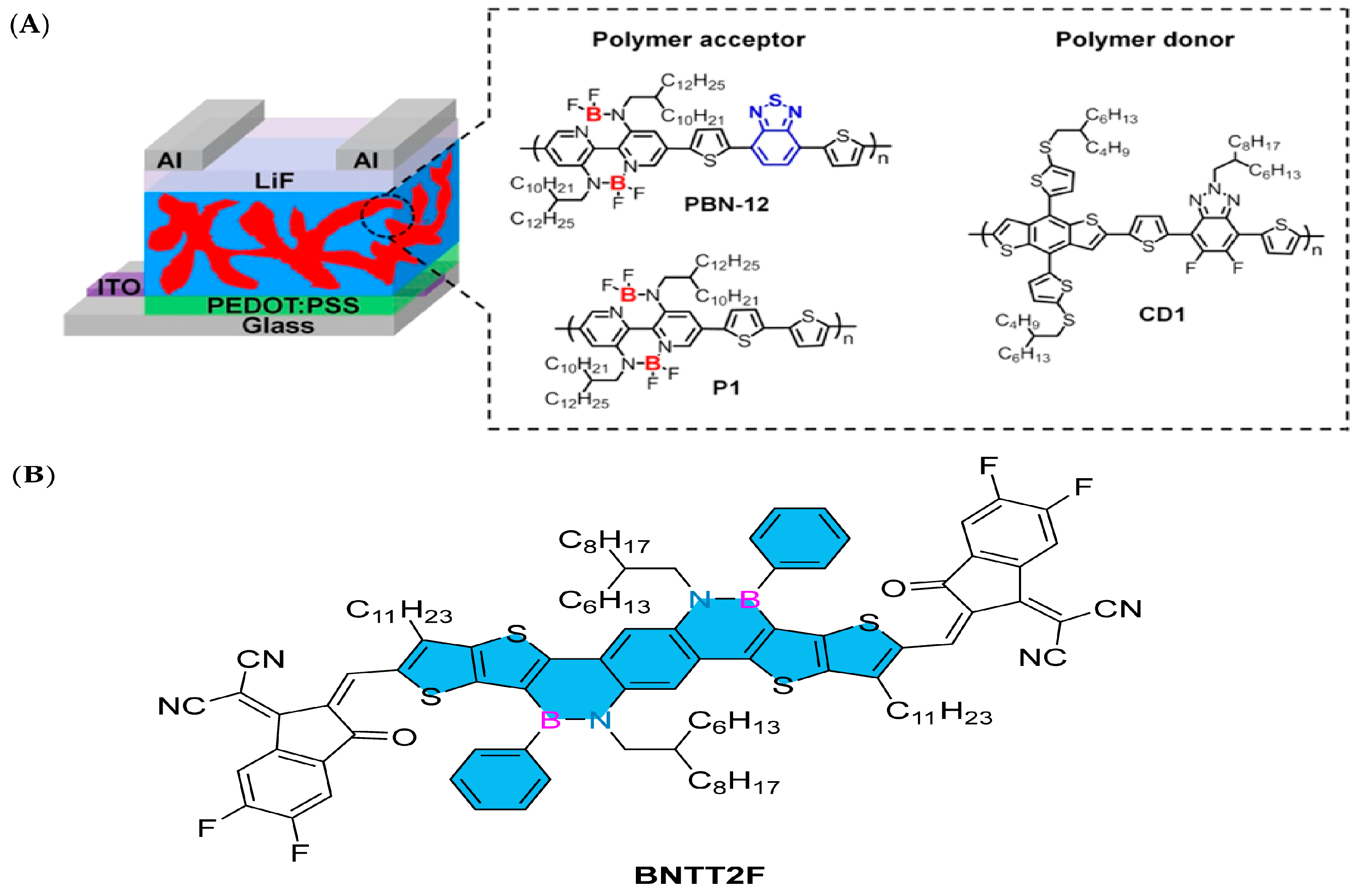 - Zhao, R.Y.; Wang, N.; Yu, Y.J.; Liu, J. Organoboron Polymer for 10% Efficiency All-Polymer Solar Cells. Chem. Mater. 2020, 32, 1308–1314. [Google Scholar] [CrossRef]