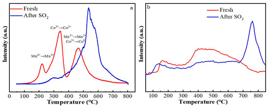 Hydrogen temperature-programmed reduction (H2-TPR) analyses were conducted to evaluate alterations in redox properties induced by SO2 poisoning of the catalyst (Figure 6a). The fresh catalyst exhibited three distinct reduction stages: reduction of Mn4+ to Mn3+ commencing at approximately 220 °C [27], conversion of Co3+ to Co2+ centered at 342 °C; and subsequent parallel reductions of Mn3+ to Mn2+ and Co2+ to metallic Co (Co0) peaking at 466 °C [28,29]. Upon exposure to SO2, the reduction temperature of Mn4+ to Mn3+ increased from 220 °C to 300 °C, accompanied by a pronounced decline in peak intensity. Notably, a new H2 consumption band appeared in the poisoned sample within the 500–600 °C range. In conjunction with TG-MS data, the H2 consumption peak was attributed to the reduction of MnSO4 formed upon SO2 poisoning of the catalyst. This assignment aligns with findings from relevant literature studies [30,31]. Due to the dominance of sulfate-derived peaks, the reduction peaks of Mn3+→Mn2+, Co3+→Co2+, and the formed sulfates merged into a broad composite peak within the temperature range of 350–700 °C. Although precise quantitative analysis of H2 consumption remained challenging, we propose that following SO2 poisoning, both the reduction peaks of Mn3+→Mn2+ and Co3+→Co2+ exhibited a pronounced shift toward higher temperatures, demonstrative of significant suppression in the redox property.