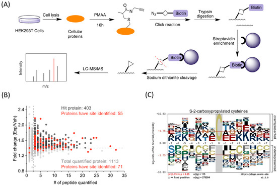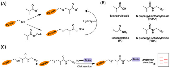 Overall, our work identified cysteine S-2-carboxypropylation in mammalian proteins and mapped out its proteomic distribution in the proteome. Additionally, the PMAA chemical probe we developed in this present study would serve as a useful tool for studying other cysteine-participating protein modifications.