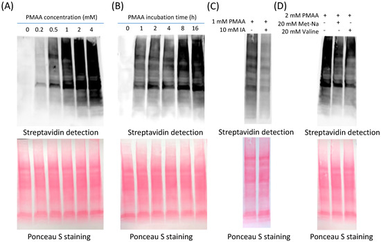 Evaluation of the probe PMAA labeling to detect S-2-carboxypropylation in native proteomes. (A) Concentration-dependent labeling of PMAA with cellular proteomes. HEK293T cellular proteins were incubated with probe PMAA with indicated concentration at 37 °C for 12 h, followed by CuAAC reaction to conjugate with biotin and detected by streptavidin-HRP. (B) Time-dependent labeling of PMAA with cellular proteomes. HEK293T cellular proteins were incubated with 2 mM PMAA at 37 °C for indicated time, followed by CuAAC reaction. (C) Using iodoacetamide (IA) as a competitive probe to block free cysteine. The HEK293T cellular proteins were pretreated with 10 mM IA for 2 h and then incubated with 1 mM PMAA for another 4 h (37 °C), followed by CuAAC reaction. (D) Competition of PMAA labeling by endogenous S-2-carboxypropylation induced by sodium methacrylate (Met-Na) and valine. HEK293T cells were incubated with 20 mM Met-Na or 20 mM valine separately, and the resulting cellular proteins were reacted with 2 mM PMAA at 37 °C for 12 h, followed by CuAAC reaction.