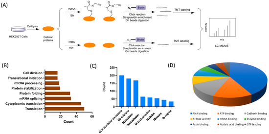 Quantitative proteomic profiling of S-2-carboxypropylated proteins by PMAA. (A) Schematic description of TMT-based multiplexed proteomic profiling of S-2-carboxypropylation in HEK293T cellular proteins by PMAA. (B) Biological process analysis of S-2-carboxypropylated proteins by gene ontology. (C) Cellular component analysis of S-2-carboxypropylated proteins in HEK293T cells. (D) Representative molecular function analysis of S-2-carboxypropylated proteins.