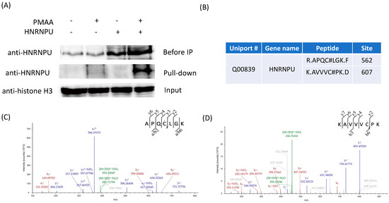 To corroborate the cysteine S-2-carboxypropylated proteins identified by our proteomic analysis, we selected the heterogeneous nuclear ribonucleoprotein U (HNRNPU) protein from our proteomic data list for biochemical validation. It has been found that the dysfunction of HNRNPU is related to neurodevelopmental syndromes, and that excess methacrylyl-CoA can also cause neurological disorders [18,35]. In the experiment, the HNRNPU plasmid (Addgene, Watertown, MA, USA, plasmid #35974) was transiently transfected into HEK293T cells and then the lysate protein mixture was labeled by PMAA, conjugated with azide-diazo-biotin, and enriched by streptavidin beads [36]. Thereafter, the labeled proteins were eluted by sodium dithionite. Enhanced-HNRNPU-labeling intensity was observed via Western blot when both the HNRNPU overexpression and PMAA probe were applied, which demonstrated that the intracellularly expressed protein HNRNPU was indeed labeled by PMAA, which was then pulled down by streptavidin beads (Figure 5A). Furthermore, we sought to confirm the identified C2cp sites on HNRNPU and investigated whether the modification was induced by Met-Na or methacrylyl-CoA. Based on our site-specific proteomic data, we identified two modification sites on HNRNPU by the probe PMAA, which were Cys562 and Cys607 (Figure 5B). We incubated the HNRNPU-overexpressed cell lysate proteins with either 1mM Met-Na or 1mM methacrylyl-CoA and then enriched the HNRNPU with anti-HNRNPU antibody. The obtained proteins were digested and further analyzed through LC-MS/MS. Using this approach, we successfully confirmed the two modification sites, Cys562 and Cys607, on HNRNPU with the treatment of methacrylyl-CoA (Figure 5C,D). On the other hand, with Met-Na incubation, we could not identify any C2cp sites, which coincided with the above observation that methacrylate is less reactive than methacrylyl-CoA. Together, these results demonstrated that PMAA was an excellent probe for profiling cellular protein C2cp, and the metabolite methacrylyl-CoA, but not Met-Na, was able to induce protein C2cp modifications.