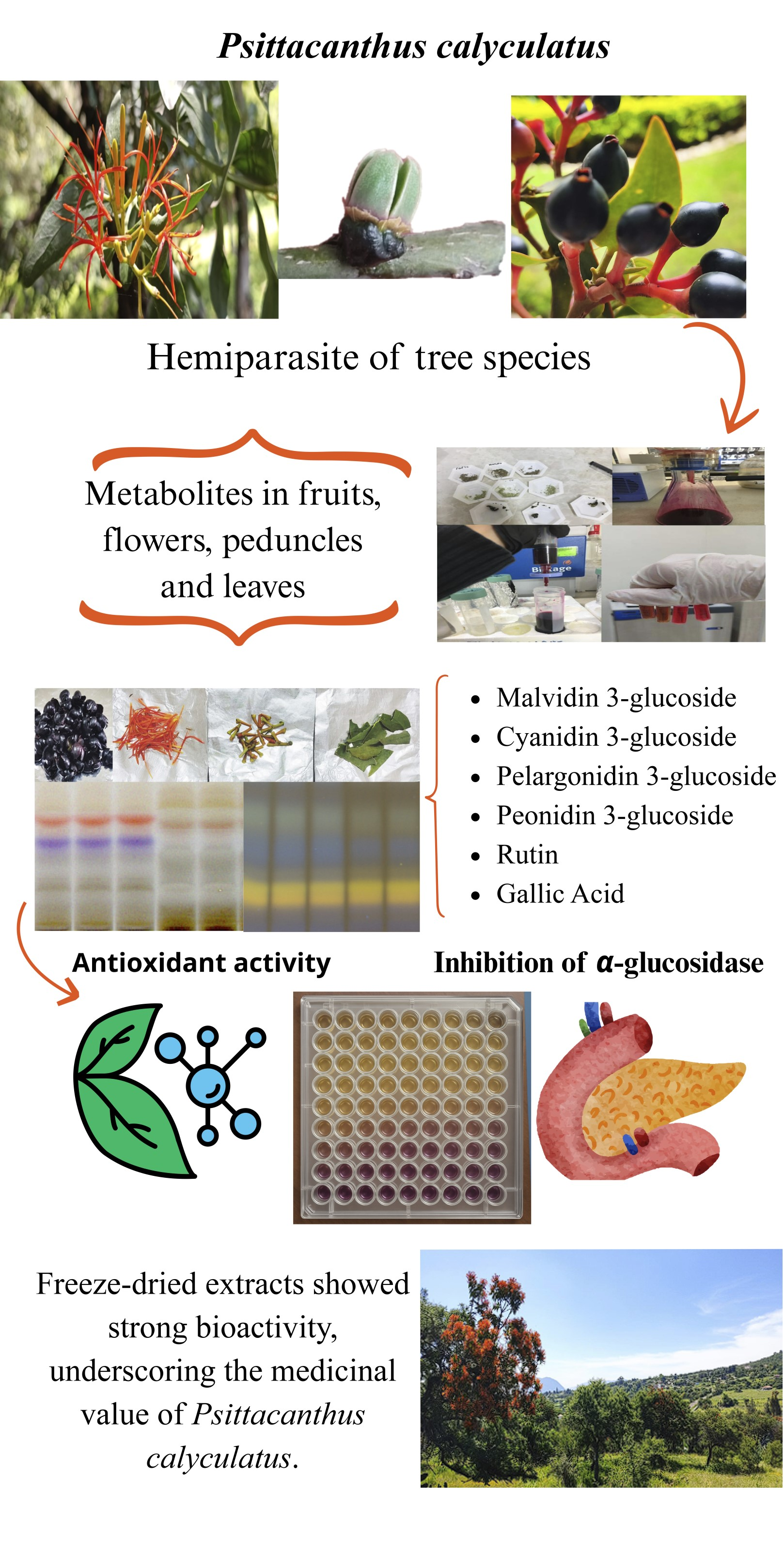 Ochoa-Cruz, Z.; Molina-Torres, J.; Mena-Violante, H.G.; Cárdenas-Valdovinos, J.G.; Villa-Santiago, M.; Angoa-Pérez, M.V. Host-Dependent Phytochemical Profiles and Antioxidant and Hypoglycemic Activities of Mexican Mistletoe (Psittacanthus calyculatus) Organs. Molecules 2025, 30, 4257. https://doi.org/10.3390/molecules30214257