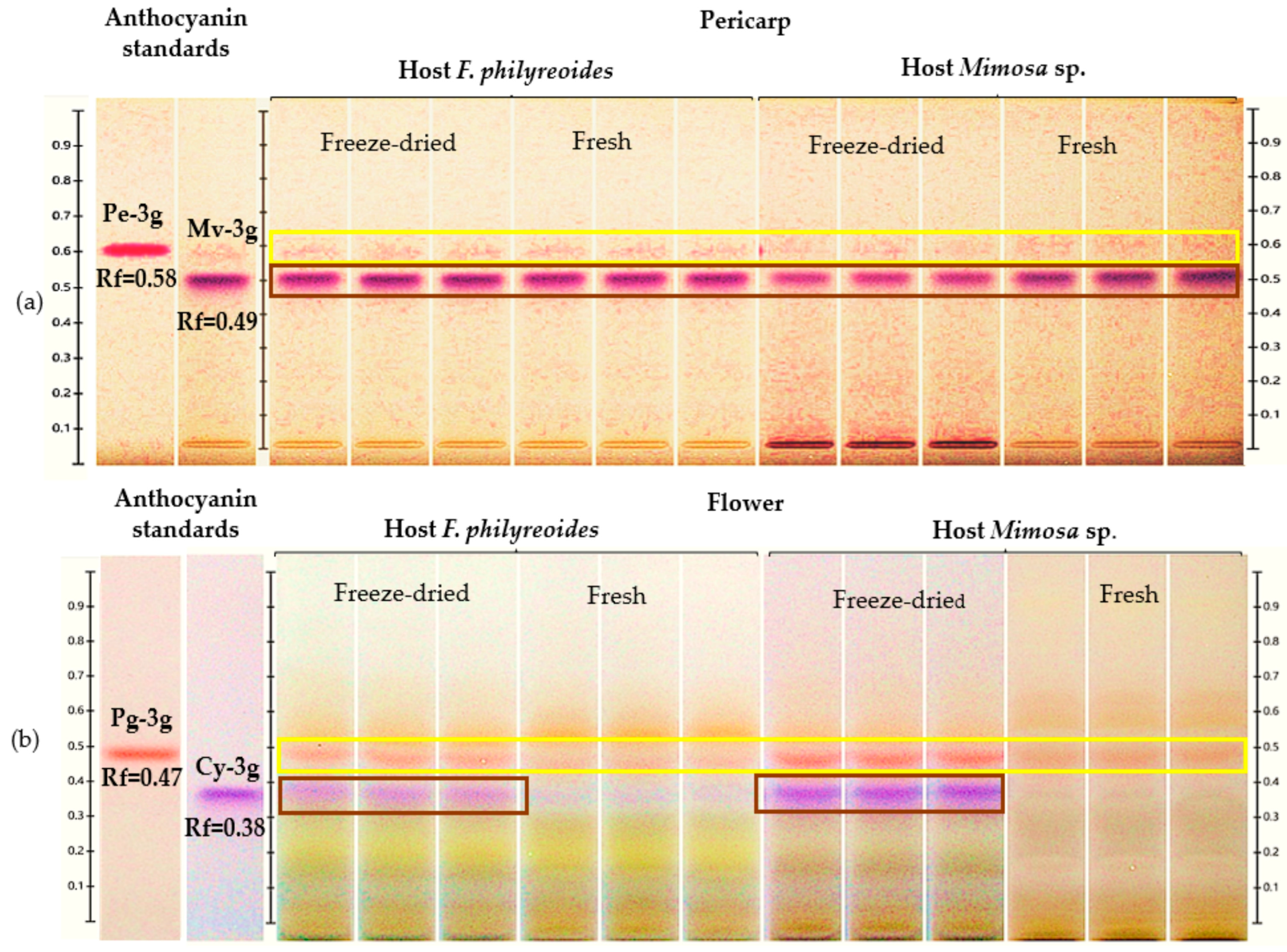 2.1. Anthocyanins and the Flavonoid Detected and Quantified by HPTLC