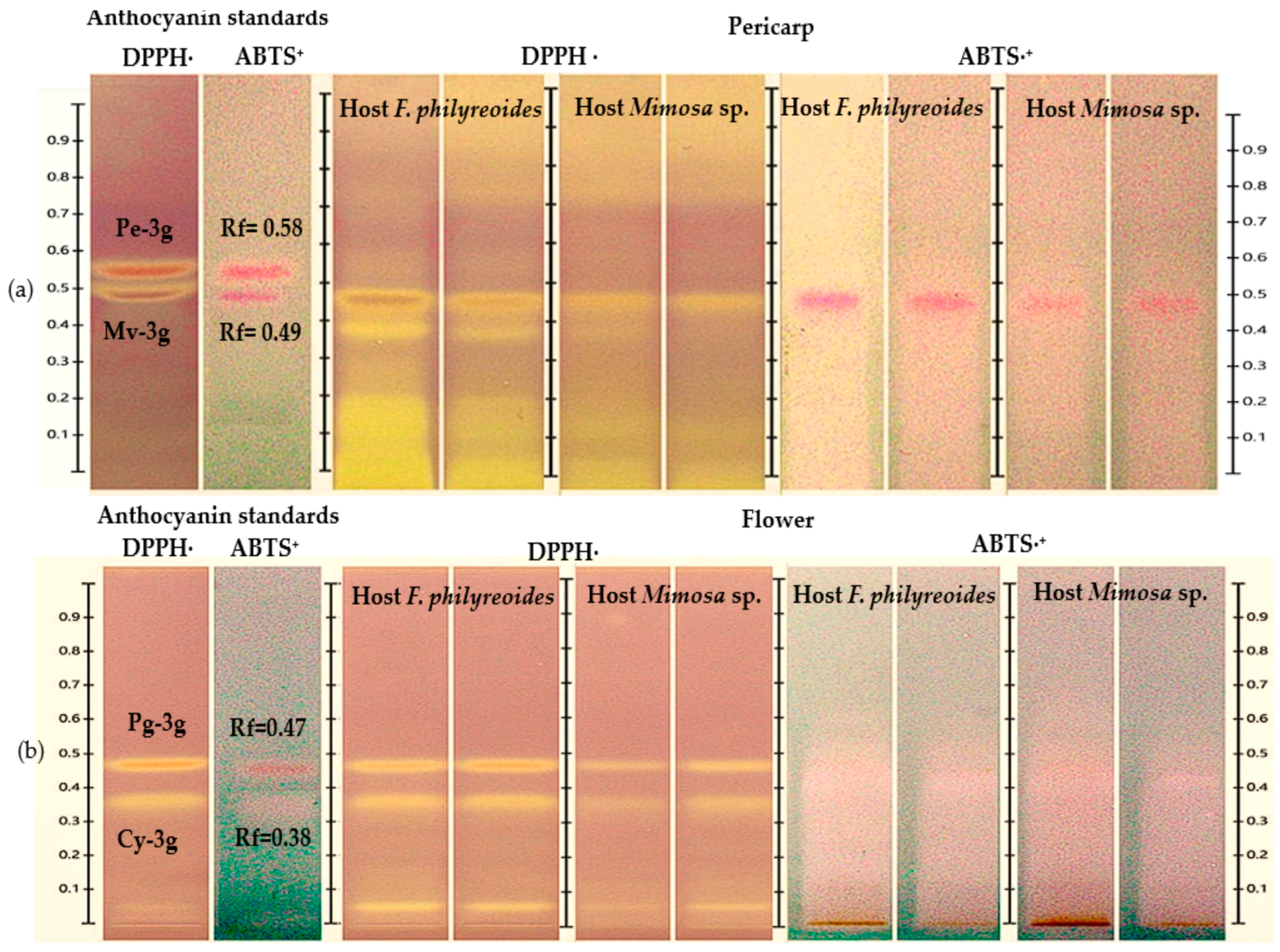 2.3.1. Antioxidant Activity by HPTLC-DPPH· and HPTLC-ABTS·+ in Pericarp and Flower