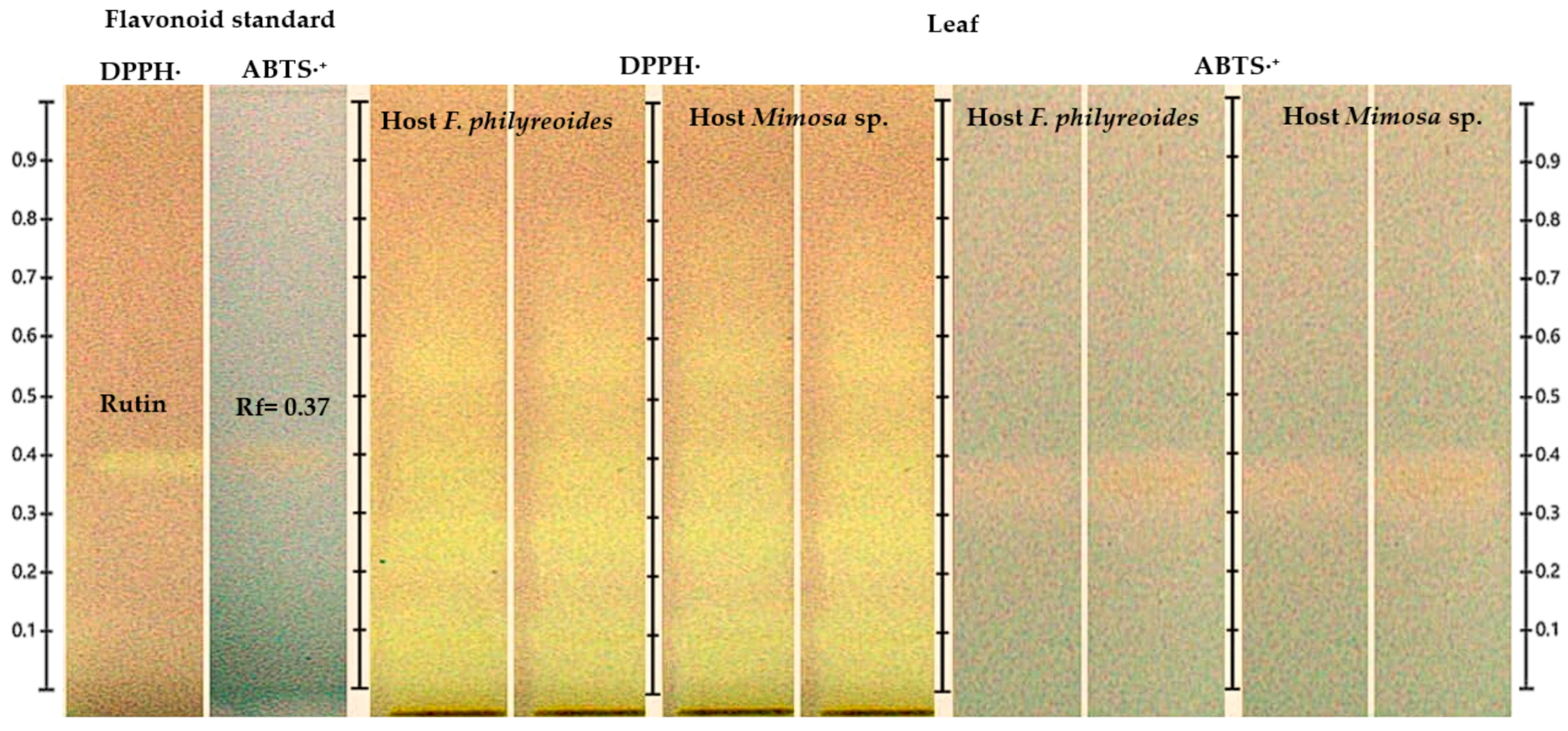 - Salasmi, K.; Remashree, A.B. Comparison of In Vitro Antioxidant Activity, Total Phenolic Content, Total Flavonoid Content and Chromatographic Evaluation of Hemiparasite Dendrophthoe falcata (L.f.) Ettingsh Growing on Four Different Medicinal Host Plants. Adv. Zool. Bot. 2023, 11, 158–170. [Google Scholar] [CrossRef]