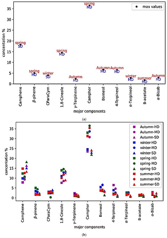 The extraction technique significantly modulated oil profiles. Microwave-assisted distillation consistently produced oils richest in oxygenated monoterpenes (54.27–59.65%), particularly camphor, 1,8-cineole, and borneol, with maximum concentrations observed in spring. The efficiency of this method can be attributed to rapid and uniform heating, which minimizes thermal degradation and preserves oxygenated volatiles [13].