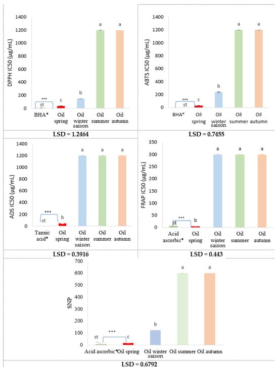 Seasonal variation in antioxidant activity of rosemary essential oils across all assays, with LSD groupings. Bars represent mean ± SD (n = 3). Different letters indicate significant differences among means according to the LSD test (p < 0.05). ***: The values are highly significant. *: Standard compounds.