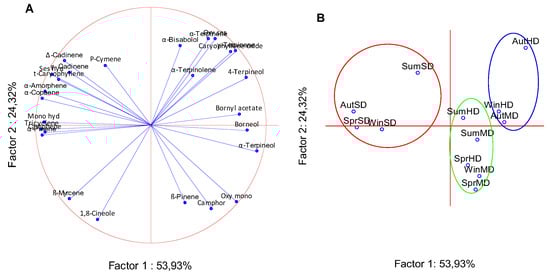 Cluster I (negative PC1) comprised steam-distilled oils. It was characterized by elevated levels of mono- and sesquiterpene hydrocarbons, including tricyclene, α-pinene, camphene, β-myrcene, α-copaene, trans-caryophyllene, γ-cadinene, and δ-cadinene. Cluster II (positive PC1; AutHD, AutMD, WinHD) was enriched in oxygenated monoterpenes such as γ-terpinene, borneol, 4-terpineol, α-terpineol, bornyl acetate, and caryophyllene oxide. Cluster III (negative PC2; SumHD, SumMD, SprHD, SprMD, WinMD) was typified by high β-pinene, 1,8-cineole, and camphor contents and comparatively lower oxygenated sesquiterpenes. PC3 explained a limited amount of additional variance and did not contribute to further biologically distinct separation.