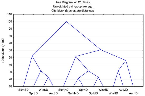 Hierarchical clustering analysis (HCA) using Manhattan distance and UPGMA linkage (Figure 6) corroborated the PCA classification, revealing two principal clusters at linkage distances of approximately 4000–5000. Within the oxygenated-monoterpene cluster, spring extracts formed a distinct sub-cluster corresponding to the highest overall bioactivity, whereas autumn samples of the same extraction group exhibited comparatively weaker effects. The strong concordance between PCA and HCA confirms the statistical robustness of the observed grouping patterns.