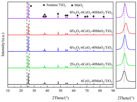 Figure 1 shows the XRD spectrum of the xFe2O3-6CeO2-40MnO2/TiO2 catalyst. It can be seen that there are obvious anatase-type TiO2 and MnO2 diffraction peaks in all catalysts, but no obvious Fe2O3 and CeO2 diffraction peaks appear, indicating that they exist in an amorphous state or are highly dispersed on the surface of the TiO2 support. When the Fe2O3 content increases, the TiO2 diffraction peak at 25.3° shifts gradually to higher angles. Combined with the Bragg equation (), it can be observed that the diffraction angle is inversely proportional to the lattice spacing. Therefore, after the Fe2O3 content increases, the lattice spacing and grain size of TiO2 in the catalyst decrease, and the lattice spacing of TiO2 in the 6Fe2O3-6CeO2-40MnO2/TiO2 catalyst decreases the most, indicating that adding an appropriate amount of Fe2O3 can promote the lattice shrinkage of TiO2. This point is also confirmed by the TEM test results presented later. This shrinkage and the resulting decrease in crystallinity increase the overall specific surface area of the catalyst, thereby enhancing the exposure area of the active component and improving the denitration performance of the catalyst.