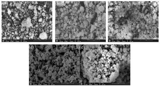 The SEM image of the xFe2O3-6CeO2-40MnO2/TiO2 catalyst is shown in Figure 2. It can be observed that the catalyst is mainly composed of particles with uneven sizes, and there are varying degrees of agglomeration. As illustrated in Figure 2a, large and dense aggregates can be clearly observed on the surface of the 6CeO2-40MnO2/TiO2 catalyst. The active components are encapsulated within these aggregates and cannot participate in the denitration reaction, which negatively affects the catalyst’s denitration performance. With the increase in Fe2O3 content, the surface particles of the catalyst become gradually finer, and the agglomeration and encapsulation phenomena decrease, indicating a relatively better pore structure. In Figure 2d, the surface particles of the 6Fe2O3-6CeO2-40MnO2/TiO2 catalyst exhibit similar sizes and a uniform distribution. A good pore structure with more micropores can provide a larger contact area for flue gas, thereby facilitating a more thorough removal of NOx during the denitration reaction.