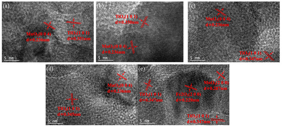 Lattice fringe pattern of xFe2O3-6CeO2-40MnO2/TiO2 catalysts ((a) 6CeO2-40MnO2/TiO2; (b) 2Fe2O3-6CeO2-40MnO2/TiO2; (c) 4Fe2O3-6CeO2-40MnO2/TiO2; (d) 6Fe2O3-6CeO2-40MnO2/TiO2; (e) 8Fe2O3-6CeO2-40MnO2/TiO2).