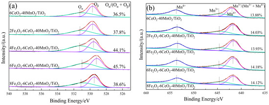 Figure 5a shows the O 1s spectrum of the xFe2O3-6CeO2-40MnO2/TiO2 catalyst. Two characteristic peaks appear in the figure at approximately 532.2 eV and 530.1 eV, corresponding to chemically adsorbed oxygen (Oα) and lattice oxygen (Oβ), respectively. With increasing Fe2O3 content, the Oα peak tends to shift to lower binding energies, and the ratio of Oα to the total surface oxygen (Oα/(Oα + Oβ)) first rises and then decreases. Since Oα exhibits higher mobility than Oβ, it is generally considered to be more reactive in redox reactions [21]. The xFe2O3-6CeO2-40MnO2/TiO2 catalyst exhibits a maximum Oα/(Oα + Oβ) value of 45.7%, indicating that an appropriate amount of Fe2O3 can promote the formation of highly active Oα species and more oxygen vacancies on the catalyst surface. This enhances the catalyst’s denitration performance, which is consistent with the denitration performance test results presented in Section 2.6.