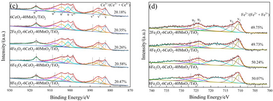 Figure 5b,c show the Mn 2p and Ce 3d spectra of the xFe2O3-6CeO2-40MnO2/TiO2 catalyst, respectively. As can be seen from the figures, when the amount of Fe2O3 added varies, the positions of the characteristic peaks and the peak areas do not change significantly. This indicates that the surface Ce4+/Ce3+ and Mn3+/Mn4+ ratios remain relatively constant, suggesting that varying the amount of Fe2O3 does not significantly alter the valence states of Mn and Ce on the catalyst surface.