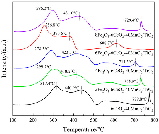In Figure 7, each catalyst sample demonstrates three reduction peaks. Among these, the reduction peaks ranging from 250 to 350 °C correspond to the reduction of Fe3+ → Fe2+, those ranging from 350 to 520 °C correspond to the reduction of Mn4+ → Mn3+, and those ranging from 520 to 800 °C correspond to the reduction of Ce4+ → Ce3+ [25,26,27]. When the amount of Fe2O3 added was gradually increased to 6%, the positions of each reduction peak shifted toward lower temperatures, suggesting that an appropriate increase in Fe2O3 content can enhance the activity of oxygen species and improve the reduction capacity of the catalyst. When the Fe2O3 content continued to increase to 8%, the reduction peaks shifted toward higher temperatures again. This may be because the addition of a small amount of Fe2O3 enhances the interaction between Fe2O3, MnO2, and CeO2 (e.g., Fe3+ + Mn3+ ↔ Fe2+ + Mn4+, Fe3+ + Ce3+ ↔ Fe2+ + Ce4+). However, excessive Fe2O3 content leads to the disruption of the electron transfer balance among the active components, thus decreasing the reduction capacity of the catalyst. In addition, as the Fe2O3 content increases, the H2 consumption associated with Fe3+ → Fe2+ gradually increases. When the H2 consumption of the catalyst sample increases, the corresponding denitrification activity of the sample also improves. At the same time, the H2 consumption for Mn4+ → Mn3+ and Ce4+ → Ce3+ also increases, demonstrating that increasing the amount of Fe2O3 can increase the number of active species on the catalyst surface, thereby increasing the relative content of surface chemisorbed oxygen, which is beneficial for the NH3-SCR reaction. This observation is consistent with the XPS analysis results.
