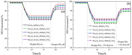 The test results of the SO2 and H2O resistance of the xFe2O3-6CeO2-40MnO2/TiO2 catalyst are shown in Figure 9. Each group of catalysts was first stabilized at 200 °C for 6 h, and then 60 ppm SO2 was introduced into the simulated flue gas. The denitration efficiency of the catalysts with SO2 contents of 0%, 2%, 4%, 6%, and 8% decreased to 80.5%, 82.6%, 83.4%, 84.8%, and 81.5%, respectively, and then gradually stabilized. After 18 h, the introduction of SO2 was stopped, and the denitration efficiency gradually recovered to a certain value and remained stable. Among them, the denitration performance of the 6CeO2-40MnO2/TiO2 catalyst was most affected by SO2, while the 6Fe2O3-6CeO2-40MnO2/TiO2 catalyst was least affected. Its denitration efficiency rose to a higher value after the introduction of SO2 was stopped. This is probably due to the fact that an appropriate amount of Fe2O3 can increase the dispersion of the active substance on the catalyst surface, providing more active sites, thereby improving the anti-SO2 performance of the catalyst.