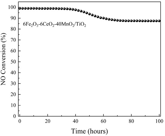 To evaluate the stability of the catalytic activity of the 6Fe2O3-6CeO2-40MnO2/TiO2 catalyst, its performance was continuously monitored for 100 h at 240 °C. Denitrification efficiency was recorded at two-hour intervals. The results are presented in Figure 10. For the first 34 h, the catalytic activity remained stable at about 99%. From 36 h onward, a decline in denitrification efficiency was observed, reaching 87.5% by 76 h. This level was maintained until the conclusion of the test.