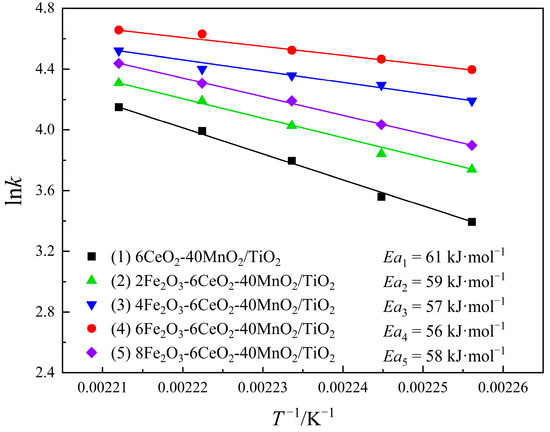 Combined with the test results of the denitration performance of the catalyst, the denitration reaction dynamics of the xFe2O3-6CeO2-40MnO2/TiO2 catalyst were studied using Equations (3) and (4). The results are shown in Figure 11. As can be obtained from Equation (4), lnk has a linear relationship with T−1. The smaller the absolute value of the slope, the smaller the reaction activation energy Ea, and the easier the denitration reaction proceeds. As the Fe2O3 content increases, the activation energy of the catalyst gradually decreases. The 6Fe2O3-6CeO2-40MnO2/TiO2 catalyst has a minimum activation energy of 56 kJ·mol−1. In addition, as the reaction temperature increases, the reaction rate of the catalyst increases. At the same temperature, the reaction rates follow the order: 6Fe2O3-6CeO2-40MnO2/TiO2 > 4Fe2O3-6CeO2-40MnO2/TiO2 > 8Fe2O3-6CeO2-40MnO2/TiO2 > 2Fe2O3-6CeO2-40MnO2/TiO2 > 6CeO2-40MnO2/TiO2, which is consistent with the denitration performance test results shown in Figure 10.
