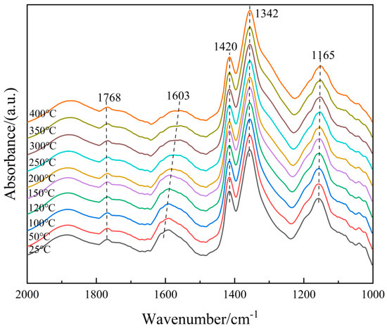 In order to further clarify the properties of the NH3(ad) species on the surface of the 6Fe2O3-6CeO2-40MnO2/TiO2 catalyst, in situ DRIFTS of NH3 adsorption at different temperatures were conducted, and the results are shown in Figure 12. Based on the spectrum of the 6Fe2O3-6CeO2-40MnO2/TiO2 catalyst, the bands that appear at 1768 cm−1, 1603 cm−1, 1342 cm−1, and 1141 cm−1 correspond to NH3 molecules coordinated to Lewis acid sites, while the band at 1420 cm−1 corresponds to NH4+ ions adsorbed at Brønsted acid sites [29,30]. As the temperature increases, the weakening of peak intensity is mainly due to thermal desorption and possible decomposition, and the attenuation rate is related to the adsorption enthalpy. By comparison, the adsorption peaks corresponding to Brønsted acid sites weaken more rapidly, probably indicating that Lewis acid sites have stronger thermal stability due to higher adsorption enthalpy. Therefore, at low temperatures, NH3 adsorption in the catalytic reaction involves both Lewis and Brønsted acid sites, whereas at high temperatures, NH3 adsorption mainly occurs at Lewis acid sites.