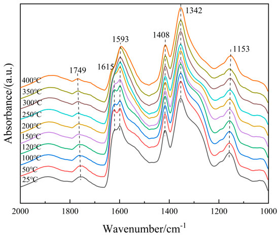 To understand the microscopic process of the NH3-SCR reaction on the 6Fe2O3-6CeO2-40MnO2/TiO2 catalyst, it is necessary to distinguish the adsorbent species on the surface of the catalyst. Therefore, an in situ co-adsorption experiment of NO + O2 was carried out on the 6Fe2O3-6CeO2-40MnO2/TiO2 catalyst, and the results are shown in Figure 13. The 6Fe2O3-6CeO2-40MnO2/TiO2 catalyst was exposed to a NO + O2 mixed gas (500 ppm NO + 5% O2, N2 balance) at room temperature, and multiple infrared vibration signal peaks appeared between 1000 and 2000 cm−1. Among them, the bands located at 1408 cm−1 and 1593 cm−1 can be attributed to bidentate nitrates; the band located at 1153 cm−1 is related to monodentate nitrates; the band located at 1342 cm−1 belongs to M-NO2 nitro compounds; the band located at 1615 cm−1 belongs to adsorbed NO2; and the band located at 1749 cm−1 belongs to the physical adsorption of NO2 [31,32]. As can be seen from Figure 11, as the temperature rises, the absorption peak intensity corresponding to monodentate nitrate (1153 cm−1) gradually decreases with increasing temperature, while the absorption peaks of bidentate nitrates (1408 cm−1 and 1593 cm−1) appear at lower temperatures and are not easily decomposed. This is due to the low thermal stability of the monodentate nitrate and a certain degree of desorption on the surface of the catalyst at high temperatures, which is consistent with the fact that bidentate nitrates are more thermally stable than monodentate nitrates. The peak intensity corresponding to the adsorbed NO2 (1615 cm−1) gradually decreases with increasing temperature, which is probably related to the effect of NO oxidation and the accelerated desorption of NO2 after the temperature increase.