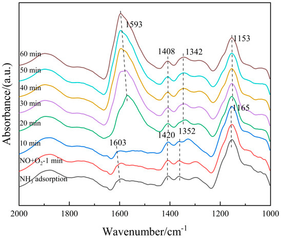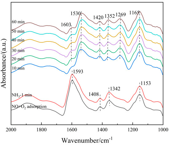 On the other hand, the 6Fe2O3-6CeO2-40MnO2/TiO2 catalyst pre-adsorbed with NO + O2 was subjected to in situ NH3 adsorption at 250 °C, as shown in Figure 15. When the 6Fe2O3-6CeO2-40MnO2/TiO2 catalyst adsorbs NO + O2 at 250 °C and reaches saturation, the absorption peaks of bidentate nitrate (1408 cm−1), monodentate nitrate (1153 cm−1), bridged nitrate (1269 cm−1), M-NO2 nitro compound (1342 cm−1), and adsorbed NO2 (1602 cm−1) can be detected. Then, the NO + O2 mixed gas is turned off and NH3 gas is introduced. Over time, the following phenomena occur: When NH3 gas is introduced for 10 min, the signals related to the adsorption of NO + O2 disappear, indicating that the nitrate species adsorbed on the surface of the catalyst have fully participated in the reaction. After 10 min, the Lewis acid sites (1165 cm−1, 1352 cm−1, and 1603 cm−1) and Brønsted acid sites (1269 cm−1, 1420 cm−1, and 1530 cm−1) adsorb NH3 species, forming corresponding absorption peaks. The intensity of each absorption peak does not change significantly with the extension of reaction time, indicating that the reaction is complete at this point. The above results show that the NOx species adsorbed on the surface of the 6Fe2O3-6CeO2-40MnO2/TiO2 catalyst can react with gaseous NH3 molecules, indicating that the NH3-SCR reaction on the catalyst surface also follows the E-R mechanism. Combining Figure 14 and Figure 15, it can be concluded that the NH3-SCR reaction on the surface of the 6Fe2O3-6CeO2-40MnO2/TiO2 catalyst follows both the L-H and E-R mechanisms, with the L-H mechanism being dominant.