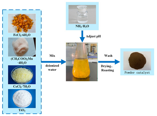 The Fe2O3-CeO2-MnO2/TiO2 catalyst was prepared by the co-precipitation method. The preparation steps are as follows: Manganese acetate tetrahydrate ((CH3COO)2Mn·4H2O, China National Pharmaceutical Group Chemical Reagent Co., Ltd., Shenyang, China), cerium chloride heptahydrate (CeCl3·7H2O, China National Pharmaceutical Group Chemical Reagent Co., Ltd., Shenyang, China), iron chloride hexahydrate (FeCl3·6H2O, China National Pharmaceutical Group Chemical Reagent Co., Ltd., Shenyang, China), and anatase (TiO2, China National Pharmaceutical Group Chemical Reagent Co., Ltd., Shenyang, China) were added to a beaker containing deionized water in a specific weight ratio. The mixture was continuously stirred for 0.5 h, and ammonia was then added dropwise to the catalyst solution until the pH reached 9~10. After that, the mixture was stirred for an additional 3 h and filtered, and deionized water was added to the filter cake. The mixture was stirred and washed for 0.5 h, and then filtered again. These operations were repeated three times. The resulting filter cake was dried at 75 °C for 24 h. Finally, the dried filter cake was placed in a muffle furnace and roasted at 400 °C for 4 h to obtain the xFe2O3-6CeO2-40MnO2/TiO2 catalyst. The x-value represents the mass percentage of Fe2O3 in the entire catalyst (×100), and the values used were 0, 2, 4, 6 and 8. The actual x-value was determined by ICP and rounded to the nearest integer. The preparation process is shown in Figure 16.