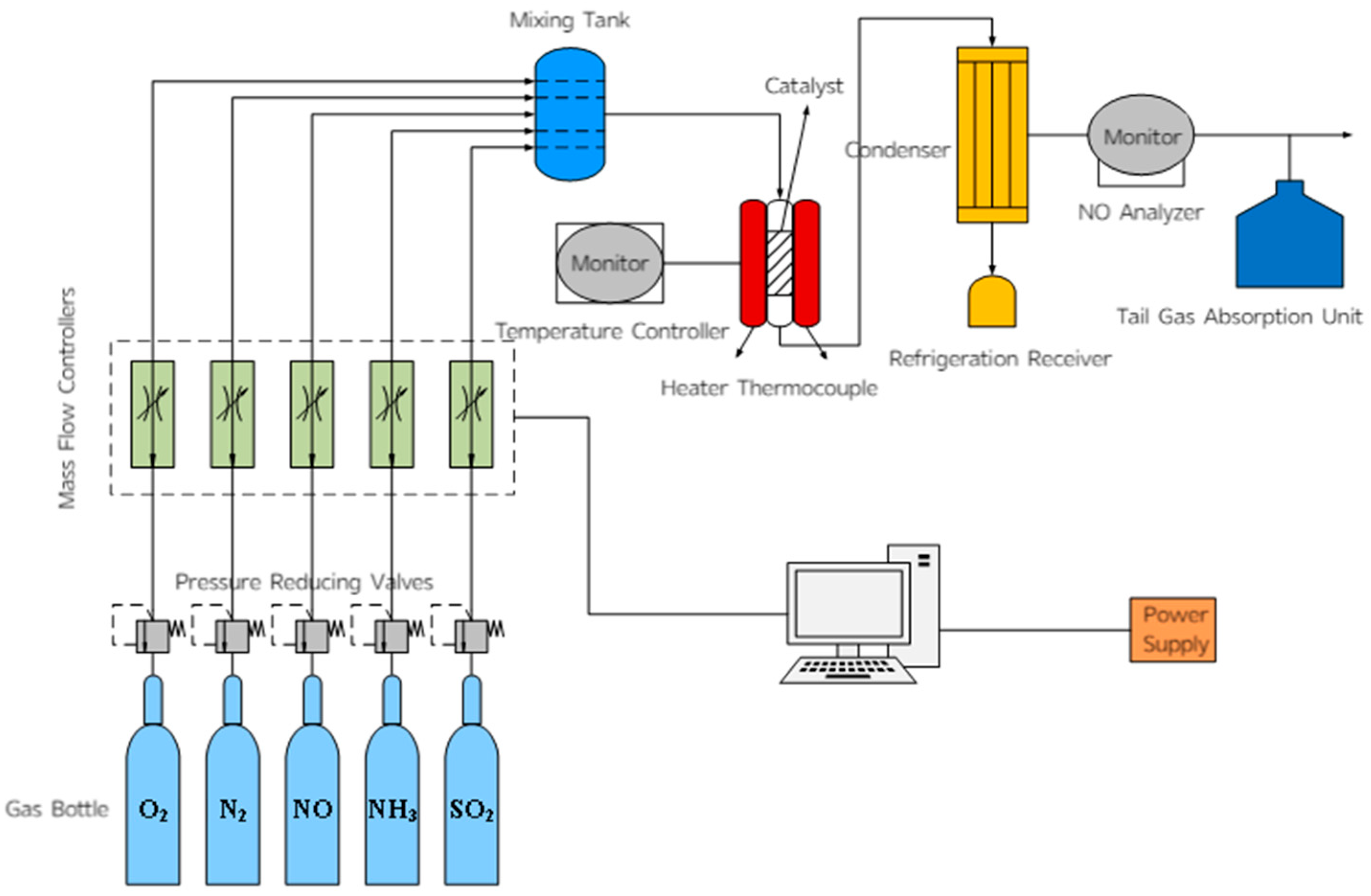 - Qiu, L.; Li, D.; Li, H.; Ren, Z.; Zhu, Z.; Ouyang, F.; Guo, M. Improvement of Sulfur and Water Resistance with Fe-Modified S-MnCoCe/Ti/Si Catalyst for Low-Temperature Selective Catalytic Reduction of NO with NH3. Chemosphere 2022, 302, 134740. [Google Scholar] [CrossRef]