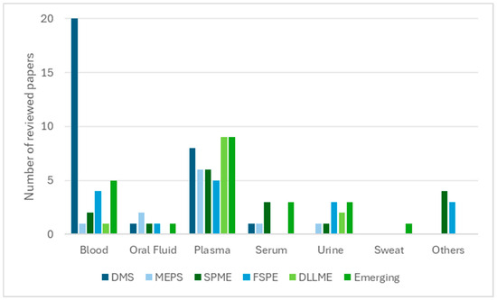 Relationship between biological matrices and extraction techniques (number of reviewed papers).