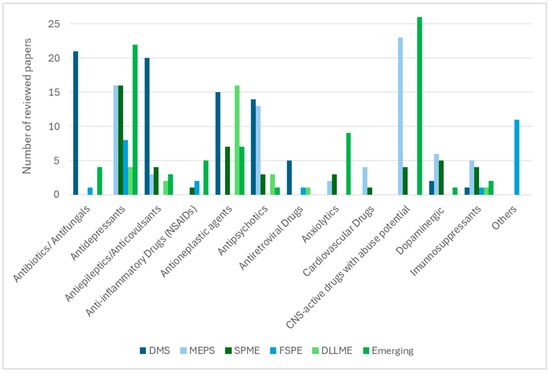 Distribution of drug classes analysed according to the extraction technique (based on the number of reviewed papers).