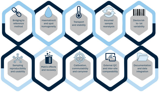 The increasing use of decentralised sampling, including remote and home-based collection, introduces further analytical demands. Ensuring sample stability after collection—particularly during drying, storage, and transport—is essential to prevent analyte degradation. In addition, maintaining traceability and chain of custody is critical when samples are collected outside controlled clinical environments [6,30].