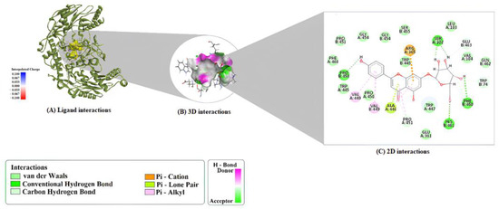Binding interactions of A7G with the target 6CNN. (A) Docked complex view, (B) 2D interaction diagram, and (C) 3D interaction map showing key non-covalent contacts.