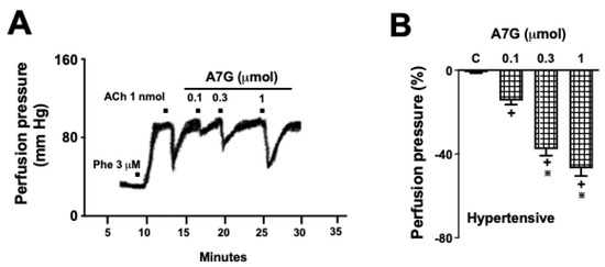 To establish a dose–response relationship in the absence and presence of hypertension, MVBs with functional endothelium, obtained from both SHR and Wistar rats, were pre-constricted by continuous perfusion with PSS containing 3 µM Phe. Once a stable perfusion pressure was reached, doses of A7G (0.03, 0.1, 0.3, and 1 µmol) were injected into the system at 3 min intervals, and the resulting changes in perfusion pressure were recorded.