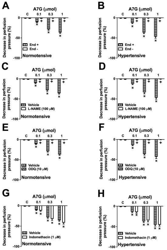 Since the vasodilator response to A7G was similar in both normotensive and hypertensive animals, the underlying pharmacological mechanisms were investigated in WKY and SHR rats. This model was selected given the therapeutic relevance of vasodilator drugs for the treatment of hypertension. To determine the contribution of the endothelium, a separate set of MVBs underwent endothelial denudation via a 30 s perfusion with sodium deoxycholate (1.8 mg/mL). After a 40 min stabilization period, the successful removal of functional endothelium was confirmed by the lack of a vasodilatory response to acetylcholine (ACh, 1 nmol). Subsequently, a dose–response curve to A7G (0.1, 0.3, and 1 µmol) was constructed in these endothelium-denuded preparations.