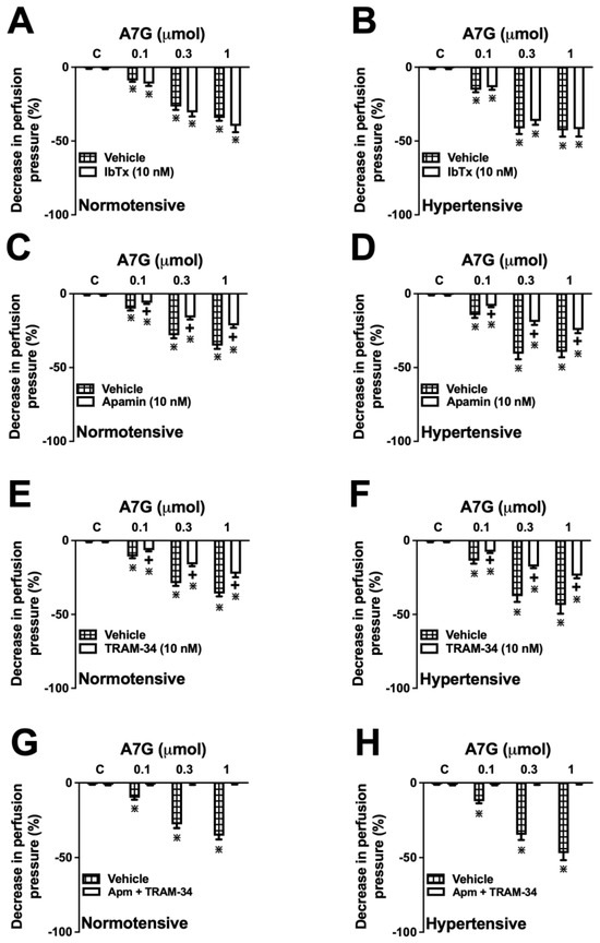 Role of intermediate- (IKCa) and small-conductance (SKCa) Ca2+-activated K+ channels in the vasodilatory effect of A7G in Wistar Kyoto (normotensive) and spontaneously hypertensive rats (hypertensive). The panels show the vasorelaxant effect of A7G in the absence (vehicle) or presence of Iberiotoxin (IbTx, 10 nM), a selective large-conductance Ca2+-activated K+ (BKCa) channel blocker (A,B), apamin (10 nM), a selective small-conductance Ca2+-activated K+ (SKCa) channel blocker (C,D), TRAM-34 (10 nM), a selective intermediate-conductance Ca2+activated K+ (IKCa) channel blocker (E,F); or a combination of apamin and TRAM-34 (G,H). Values are expressed as the mean ± S.E.M. (n = 6). + p < 0.05 vs. vehicle group; * p < 0.05 vs. previous dose.